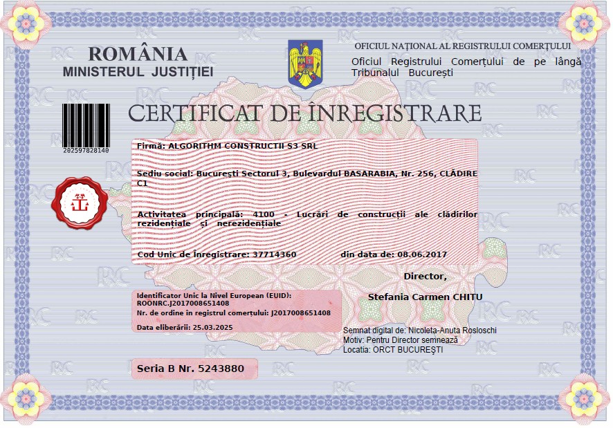 Societatea ALGORITHM CONSTRUCTII S3 S.R.L. este persoană juridică română, inregistrata la Registrul Comertului sub numarul J2017008651408, avand CUI 37714360, înfiinţată de catre Societatea ALGORITHM RESIDENTIAL S3 SRL in vederea realizarii lucrarilor de interventie necesare pentru punerea in siguranta, reabilitarea si consolidarea monumentului istoric”Hala Laminor”.